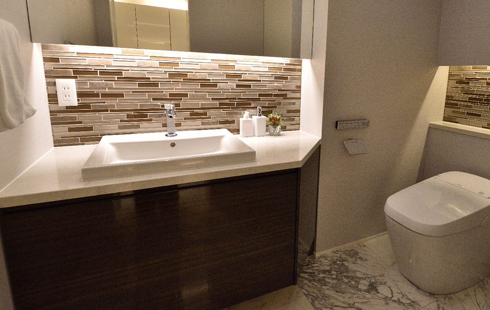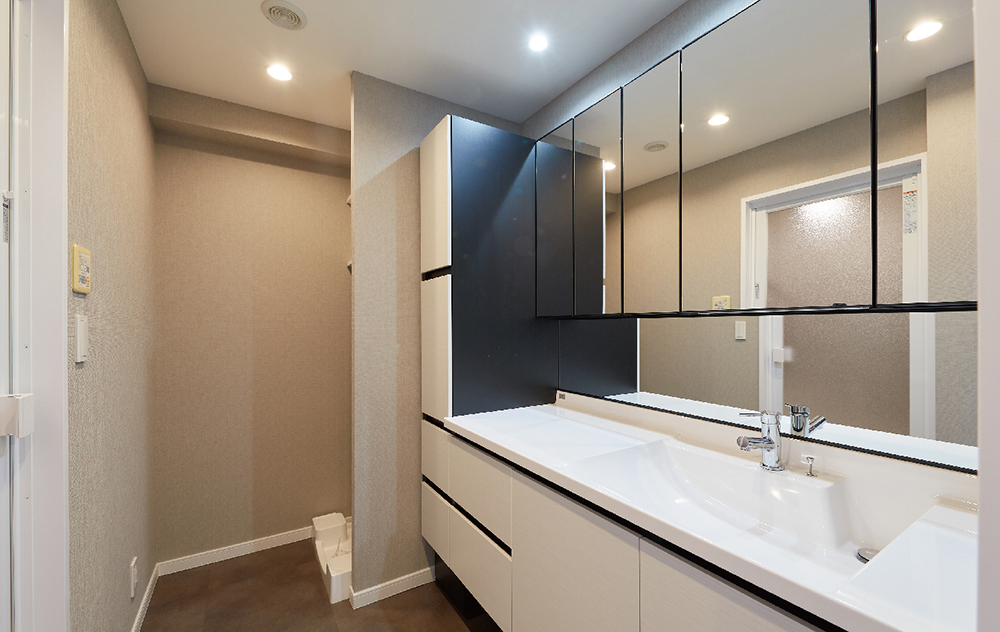 洗面化粧台は、設置条件とご要望を伺い完全オーダーメードでご提案、変形の空間にも対応することができました。
