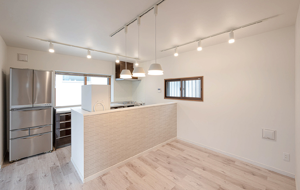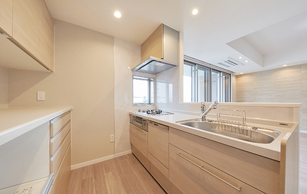キッチンはコの字型から2列型へ変更。吊戸をなくすことで、より開放的なキッチンへ。家電や食器収納を集約することで、動線がスムーズになるよう工夫しました。