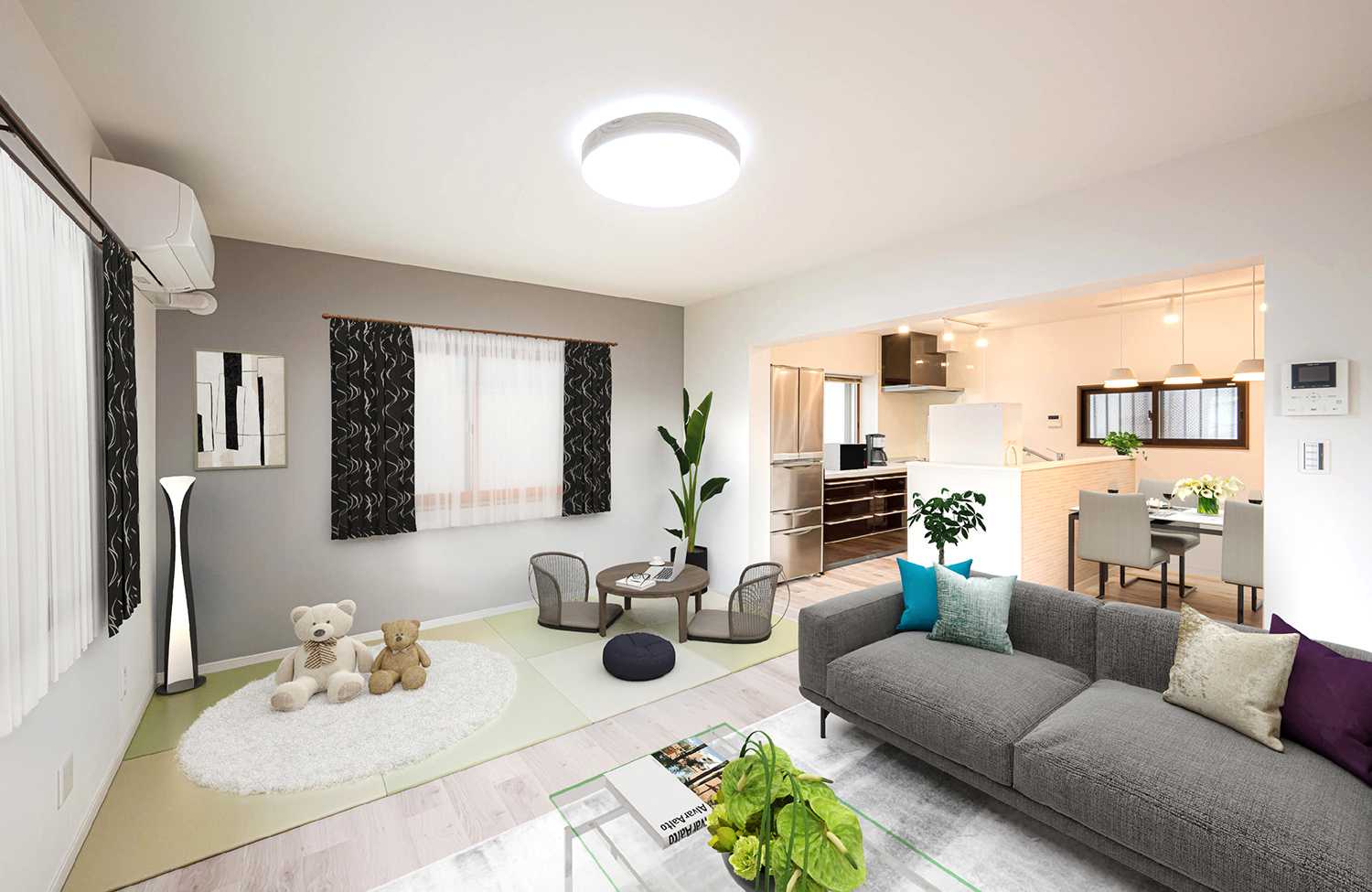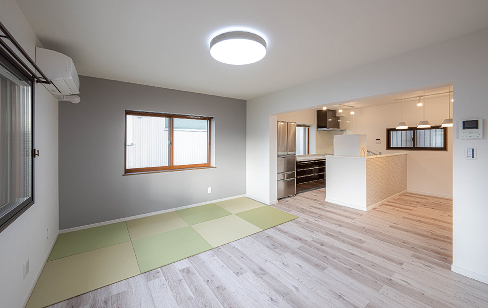 リビングには畳エリアをご希望だったため、お好みに合わせて設置ができる置き畳を採用しています。また、各所に収納場所を確保し、将来お荷物が増えてもたっぷりしまえるように工夫しています。